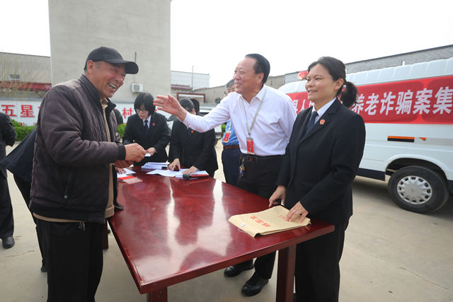 日前,安阳县人民法院法官来到瓦店镇,将追回的3.4万余元逐一送到十余名受害老人手中,并开展反诈普法宣传。近年来,该院坚持打击犯罪与追赃挽损并重,用实际行动守护老年人的“钱袋子”。图为法官向老人发还追回的养老钱。记者 刘学中 摄