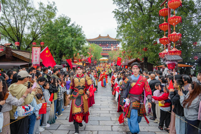 “双节”期间,开封清明上河园景区的路演吸引了来自全国各地的游客驻步观赏。记者 王健 摄