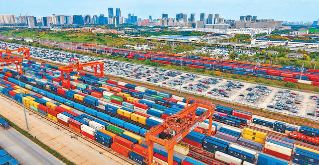 10月21日,位于中国铁路郑州局集团有限公司圃田站的中铁特货作业区一片繁忙,商品车专列正进行装车作业。连日来,中铁特货郑州分公司迎来商品车出口运输高峰,通过增开至连云港等方向的密集班列,以“铁路+海运”联运模式将商品车销往全球90多个国家和地区。 聂冬晗 摄