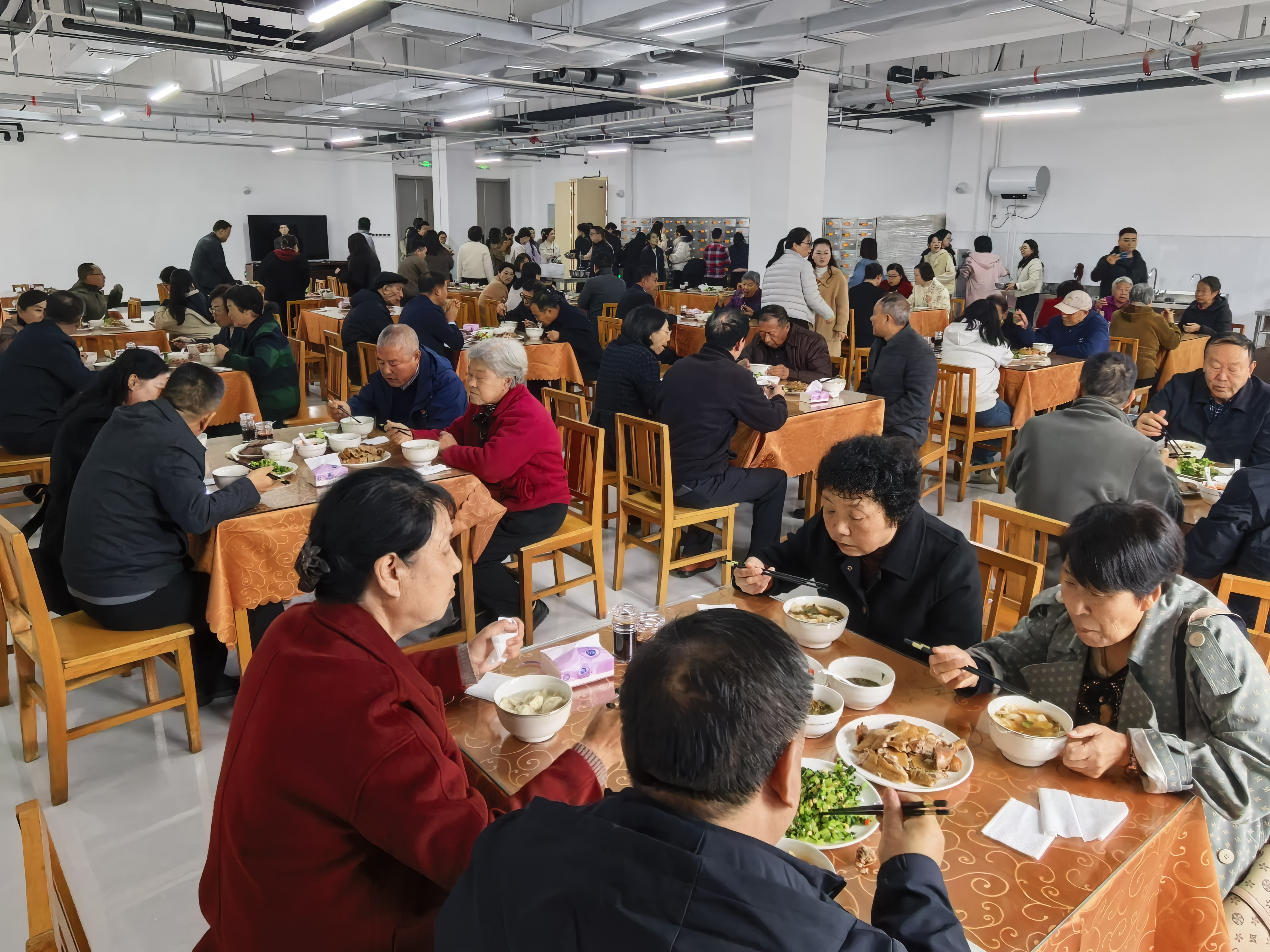 近日,卢氏县委、县政府决定,全县党政机关食堂陆续向全社会老人(60岁及以上)开放,每餐补贴2元钱。图为10月29日(重阳节)当天有30多位老人到县委机关食堂与县领导、机关干部一起就餐。张海军 摄