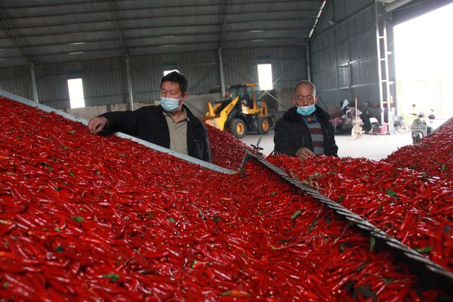 10月30日,襄城县双庙乡大李村伟涛种植农场车间内,机器轰鸣,员工们正在上料、烘烤、烘干、包装、入库,一条龙生产烘干潮湿的小尖椒。今年,该乡种植各种尖辣椒2.5万亩。李艺琼 摄