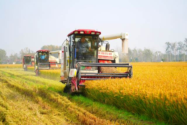 11月4日,淮滨县农场王楼分场掀起粳稻机收大会战。现场20多台收割机、24台运输车往来田间紧张作业,共收割粳稻上千亩。记者 毛云生 通讯员 王长江 摄