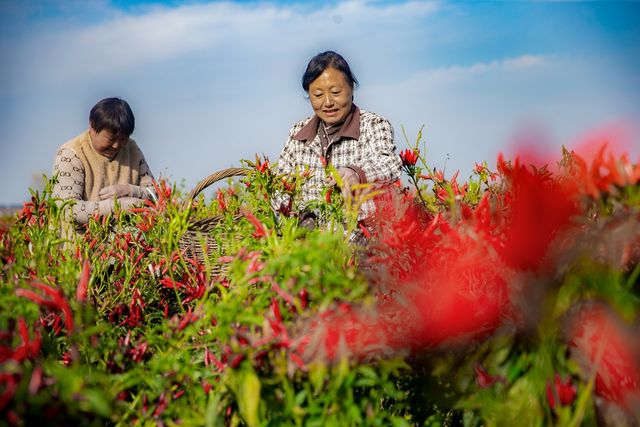 11月11日,宁陵县黄岗镇商会明集果蔬种植专业合作社的社员正在采摘小红椒。近年来,该镇积极发展特色农业种植,采取“村党支部+合作社+农户”的发展模式,规模化、订单式发展辣椒种植,推动辣椒产业高质量发展,助力乡村振兴。徐硕 摄