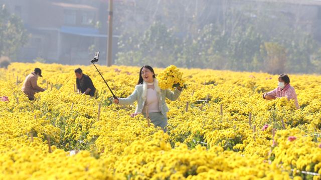11月12日,柘城县朱襄镇七里桥村菊花种植基地里,菊花金黄烂漫。村民们在花田中辛勤采摘,一位村民手持自拍杆,捧着一簇菊花,通过直播向外界分享这份丰收的喜悦。张超 摄