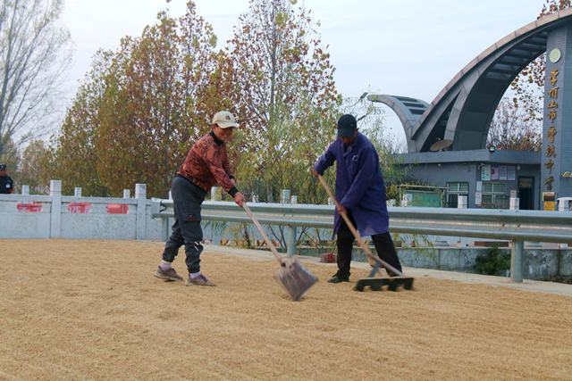 11月16日,平顶山市湛河区曹镇乡曹西村农民在晾晒稻谷。目前,曹镇乡万亩水稻已经成熟,当地农民趁晴好天气及时收割、烘干、晾晒,确保颗粒归仓。王毛生 摄