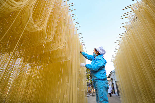 1月6日,在光山县十里镇高大店村余思虎油条挂面作坊里,村民正在晾晒传统手工油条挂面。近年来,该县采取资金扶持、信贷支持等方式,鼓励村民推广传统手工油条挂面,小小的油条挂面成了村民致富大产业。谢万柏 摄