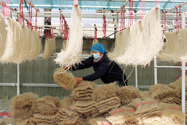 1月6日,村民正在晾晒红薯粉条。近年来,禹州市结合当地实际,积极引导广大农民种植产淀粉率高的优质红薯,投资兴建红薯深加工企业,加工粉条等十多种红薯食品,已形成“公司+基地+农户”的产业化经营模式和种苗繁育、种植、回收、加工一条龙产业链,取得良好经济效益。牛书培 摄