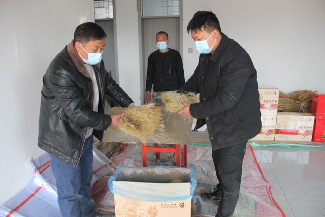 1月18日,在襄城县丁营乡王穆庄村少臣家庭农场,村干部正忙着帮农场主将新鲜制作的粉条切割、打包装箱销售。据了解,去年,该农场种植的50亩红薯喜获丰收,今年可加工生产出约两万斤优质粉条。张治煌 古今 摄