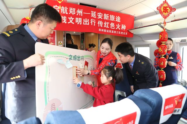1月26日10时29分,G2109/12次列车从延安站缓缓驶出,开往郑州东站,为革命老区旅客畅游中原提供新选择。列车上红歌演唱、舞蹈展示、文明出行知识有奖竞答、高铁服务礼仪展演等活动轮番上演,让旅客尽享旅途欢乐时光。同日零时起,中国铁路郑州局集团有限公司实行新的列车运行图,与全国铁路同步实施。调图后,开行图定列车1425列,较调图前增加23列;开行货物列车151列,较调图前增加6列,进一步提升客货运能和服务品质。记者 付瑞清 摄