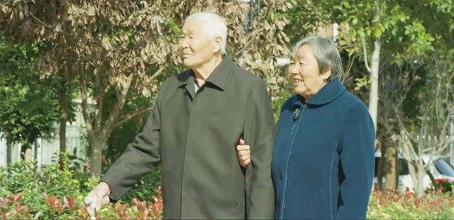 张思勤跟老伴儿一起散步。