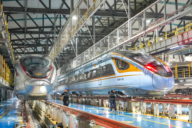 中国铁路郑州局集团有限公司工人对复兴号列车进行检修维护