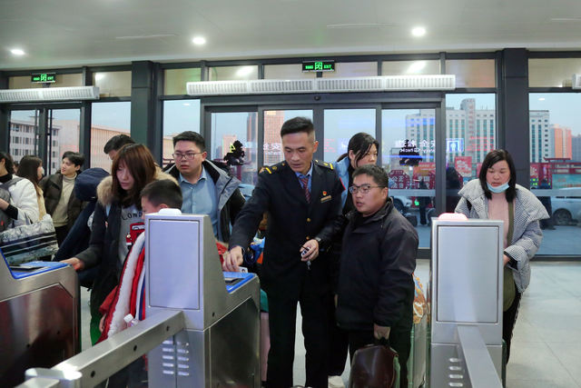 2月22日,南阳火车站工作人员帮助旅客温馨出行。记者 付瑞清 摄