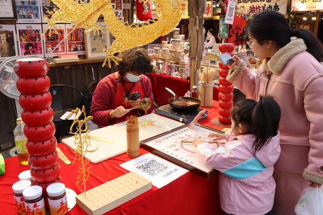 正月初七,在郑州记忆1952油化厂的非遗市集上,糖画艺人现场勾勒出栩栩如生的燕子造型,一旁的小朋友专心体验糖画制作,家长用手机定格甜蜜的非遗年味。记者 张鑫宇 摄