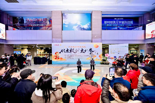 3月19日,“了不起的河洛文化——从太极到太极拳”主题快闪活动在郑州地铁紫荆山站举行。这次快闪活动打破传统的展演模式,由非遗传承人、海外太极爱好者与智能机器人同台表演,让古老太极文化走进城市通勤空间,焕发时代活力。图为快闪活动现场。记者 王健 摄