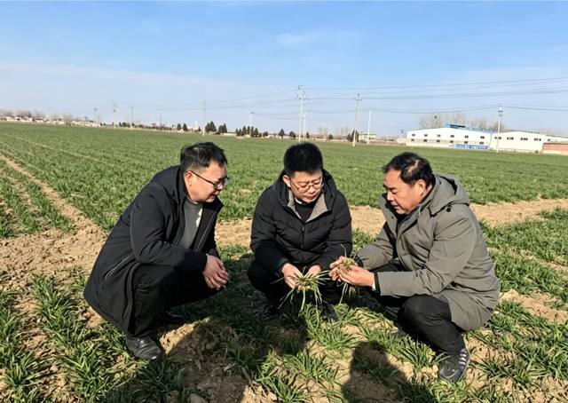 宋修勇(右一)陪同省农服集团工作人员察看小麦长势