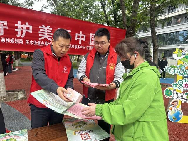 4月22日,济源济水街道携手济源示范区自然资源和规划局、机关事务中心、济源职业技术学院等单位,开展了一场别开生面的“珍爱自然资源,守护美丽中国”主题宣传活动。图为工作人员向市民发放世界地球日主题宣传海报、环保倡议书及小礼品。记者 谷太磊 通讯员 王钟毅 摄