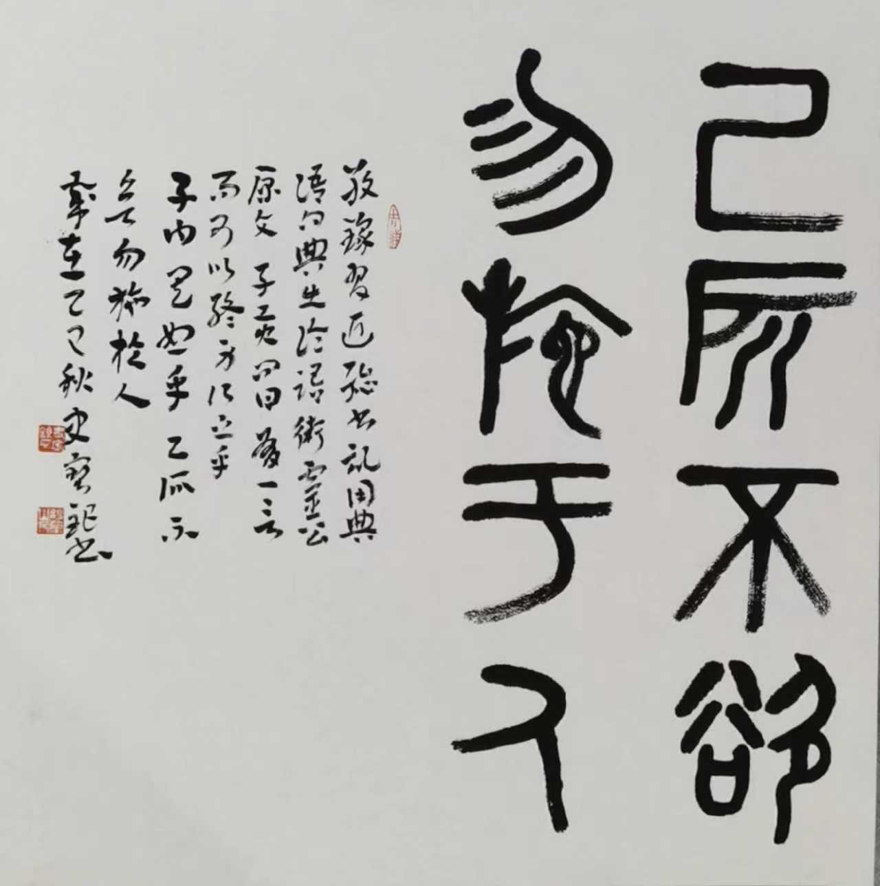 本次展览最突出的特点在于其书写内容——多为习近平总书记引用的经典名句与中华传统典籍精华。这一选择并非偶然,体现了史宝银“文以载道”“内容为王”的创作理念。史宝银以其古朴雄浑的金文书风承载蕴含治国智慧与民族精神的宏大主题,在形式上找到了最佳契合点。厚重的金石气质,恰如这些思想穿越历史长河而历久弥新,赋予文本内容以视觉化的庄重感与历史纵深感。
