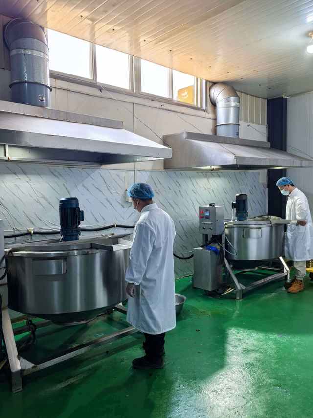穿上洁净的工服、经过风淋消毒后,记者踏入标准化生产车间,一场关于“安全与匠心”的探秘之旅就此展开。车间内,不锈钢的生产设备锃亮如新,自动化流水线有序运转,每一个操作环节都有严格的规范。在原料预处理区,工人们正戴着手套分拣辣椒,挑去品相不佳的果实;另一侧的炒料车间里,老师傅正盯着智能温控设备,调整着锅中酱料的熬制温度。