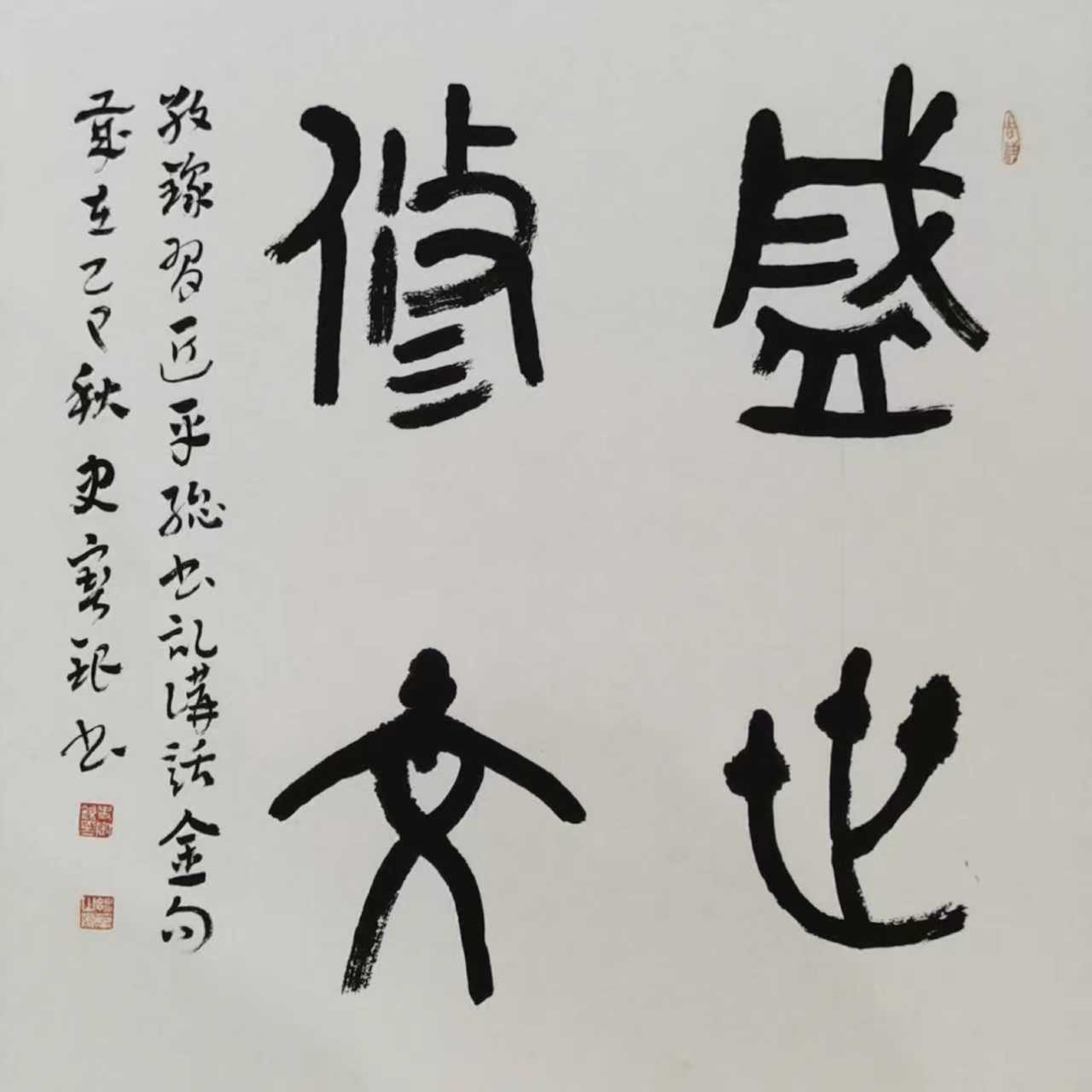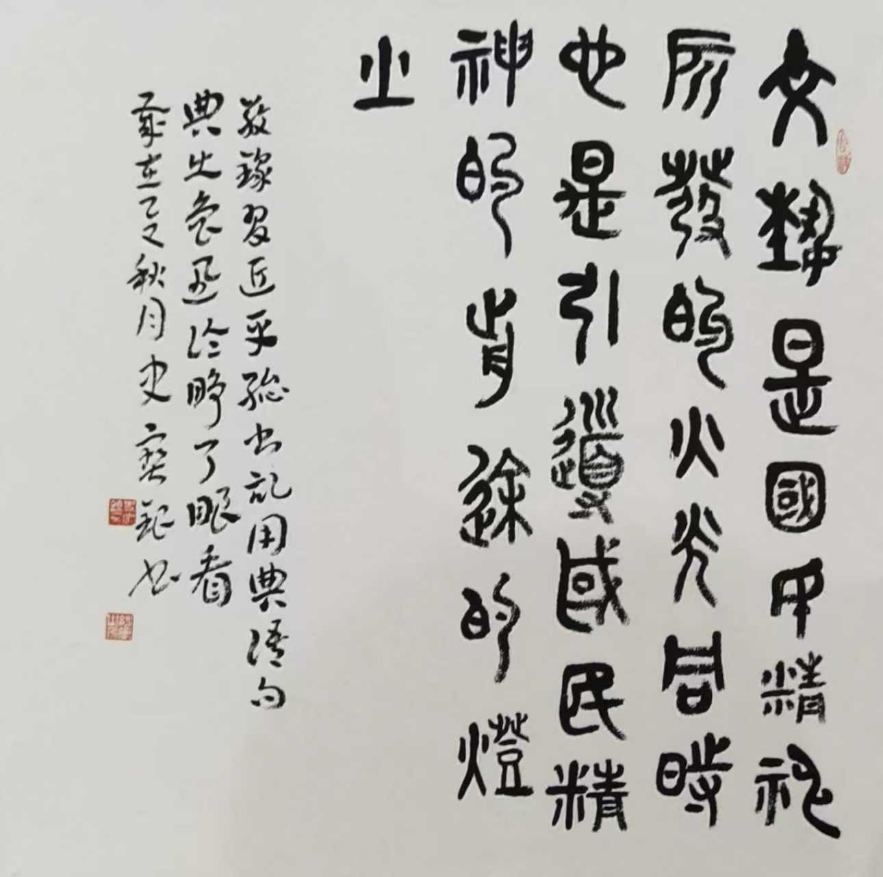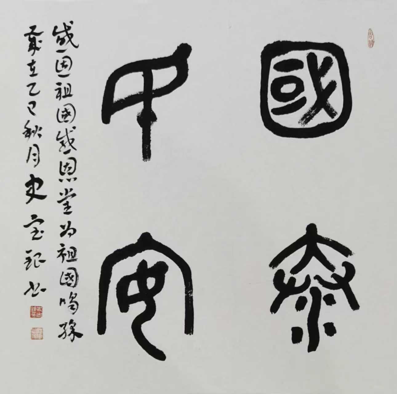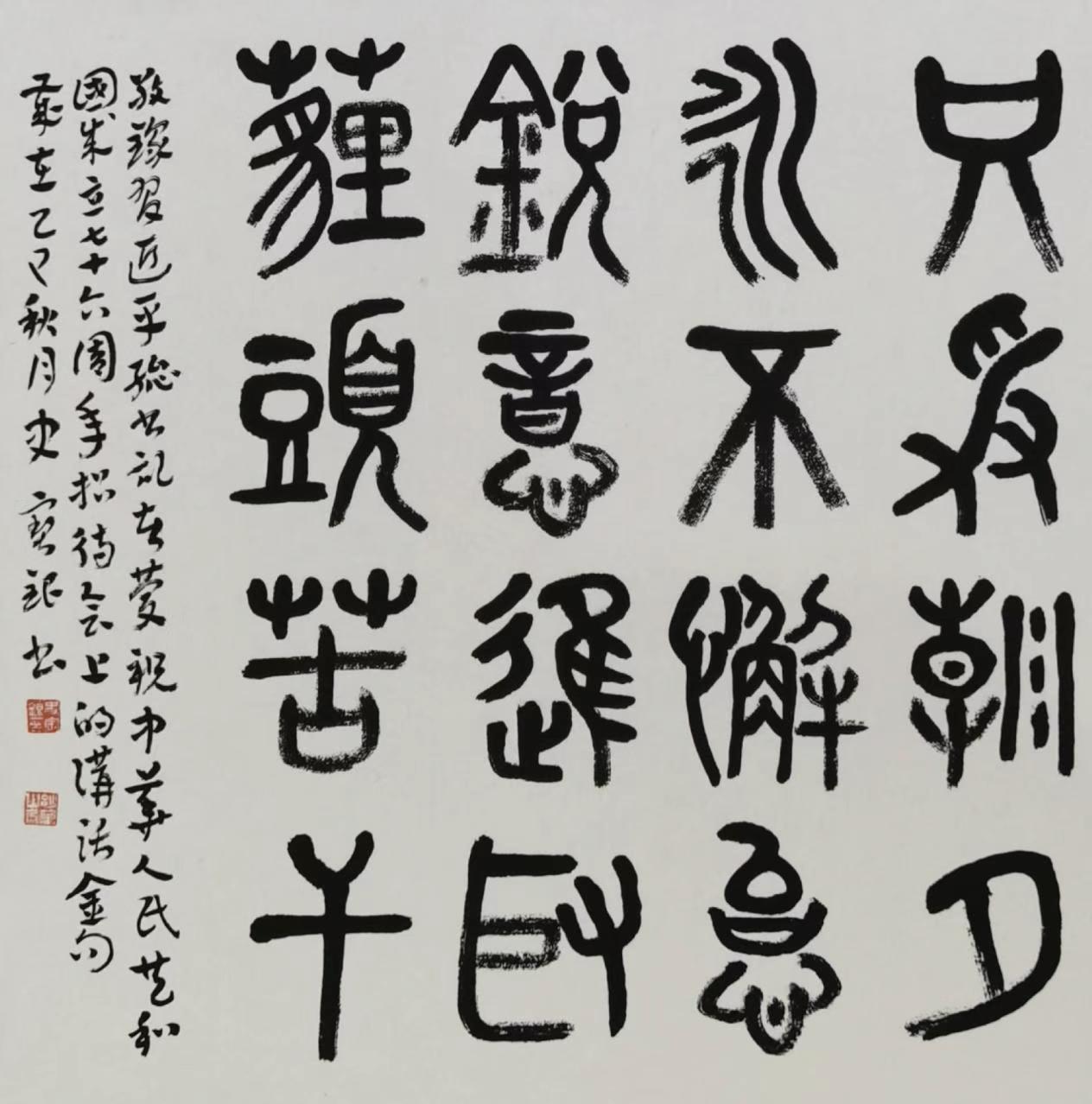 “史宝银书法小品展”共计展出史宝银精心创作的20幅篆书书法作品,书法作品的内容为习近平总书记在其重要讲话及文章中的词句或引用的古代典籍中的经典名句。笔者在现场看到,像“国泰民安”书法作品,史宝银在落款时专门下了感恩祖国、感恩党、祝福祖国,这充分彰显了书家的拳拳爱国之心。