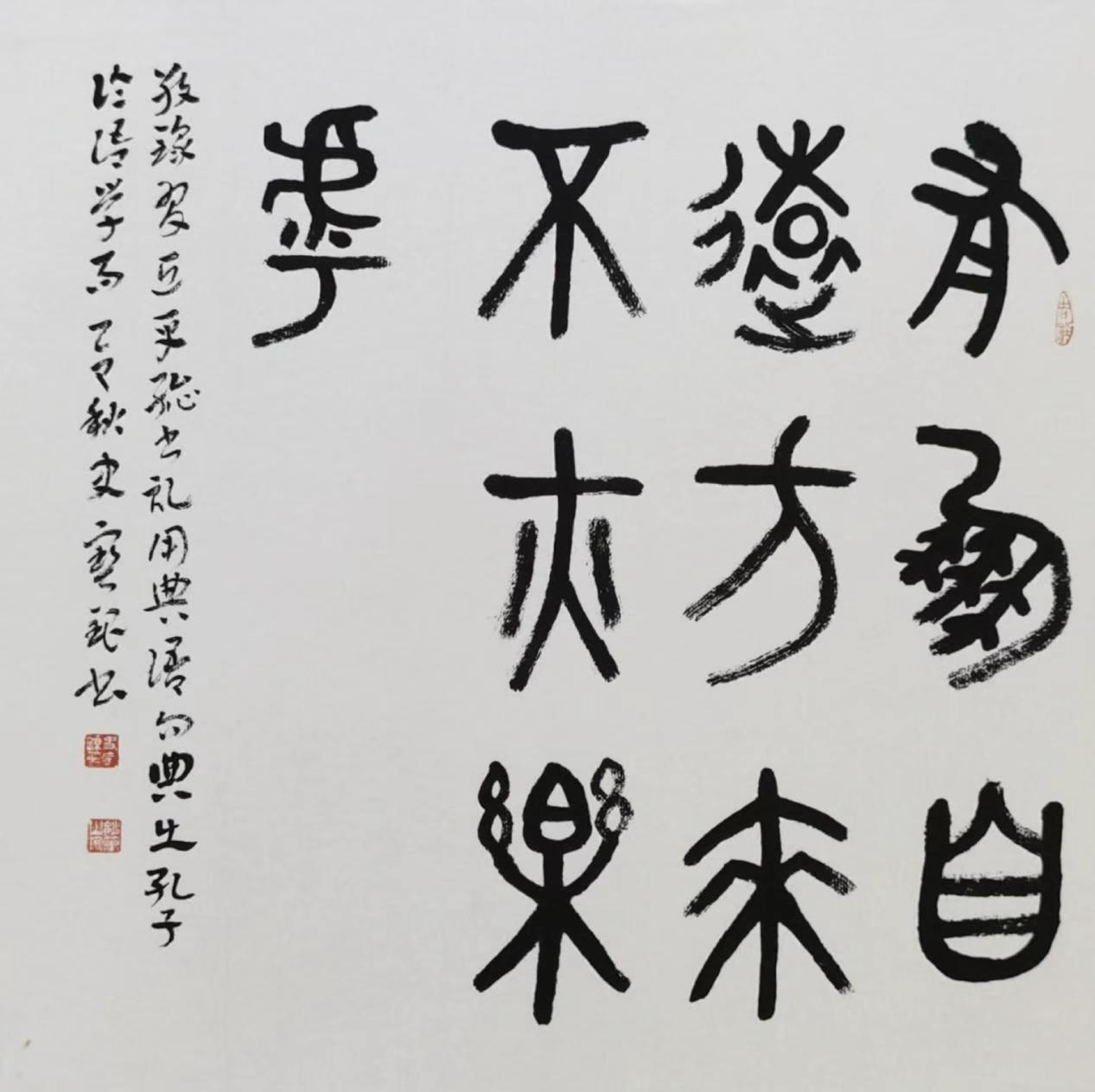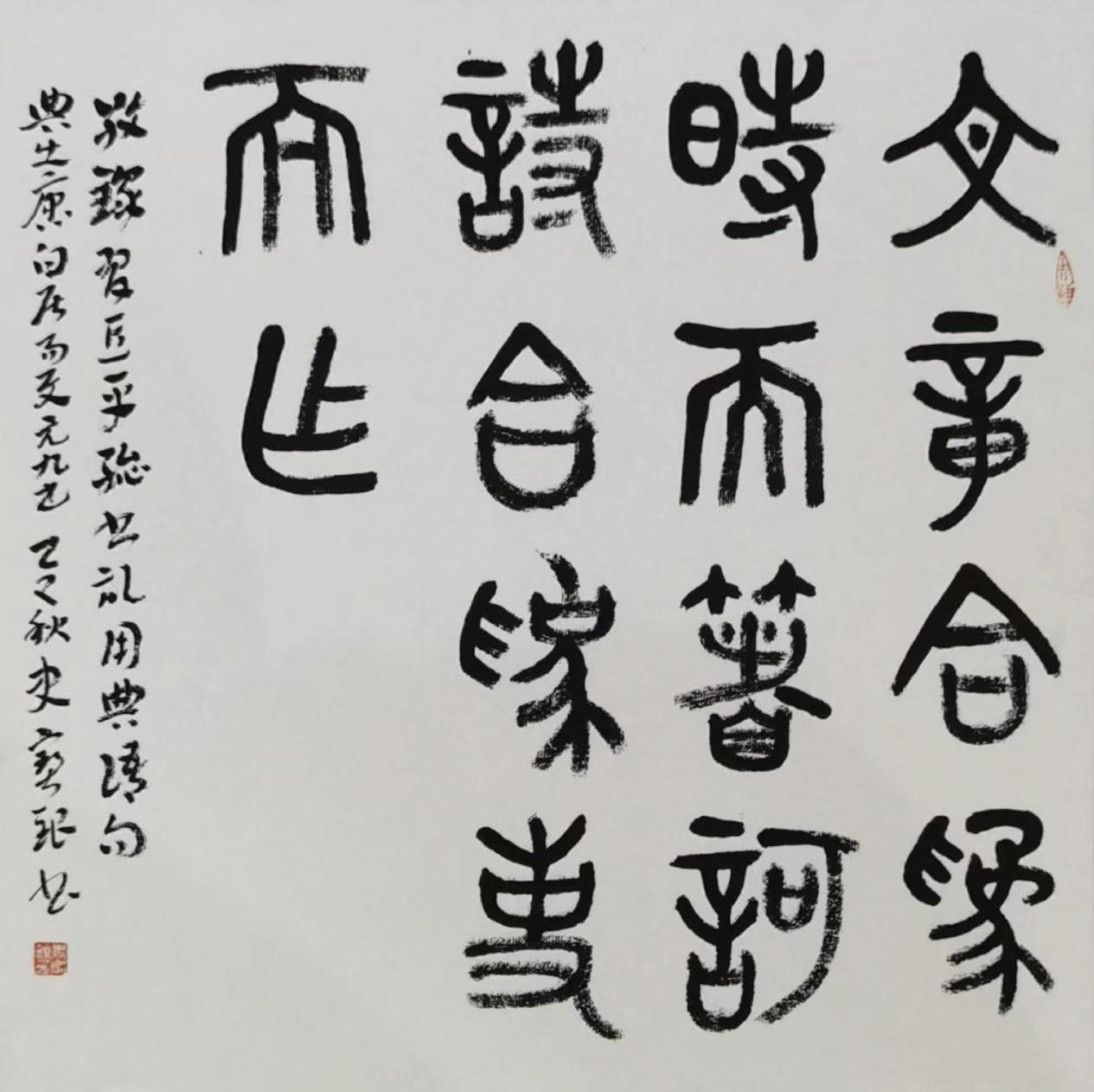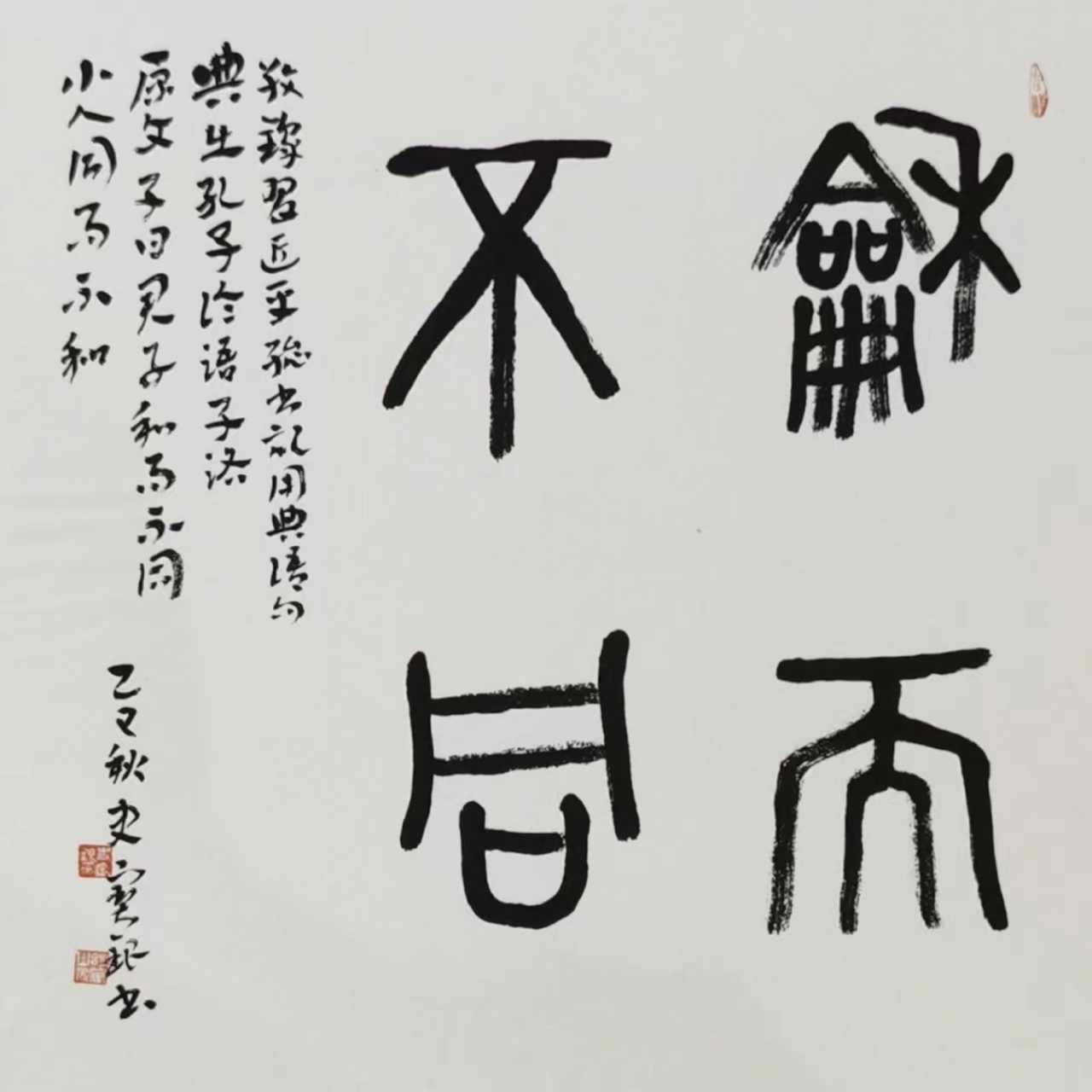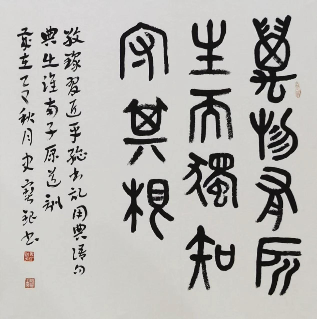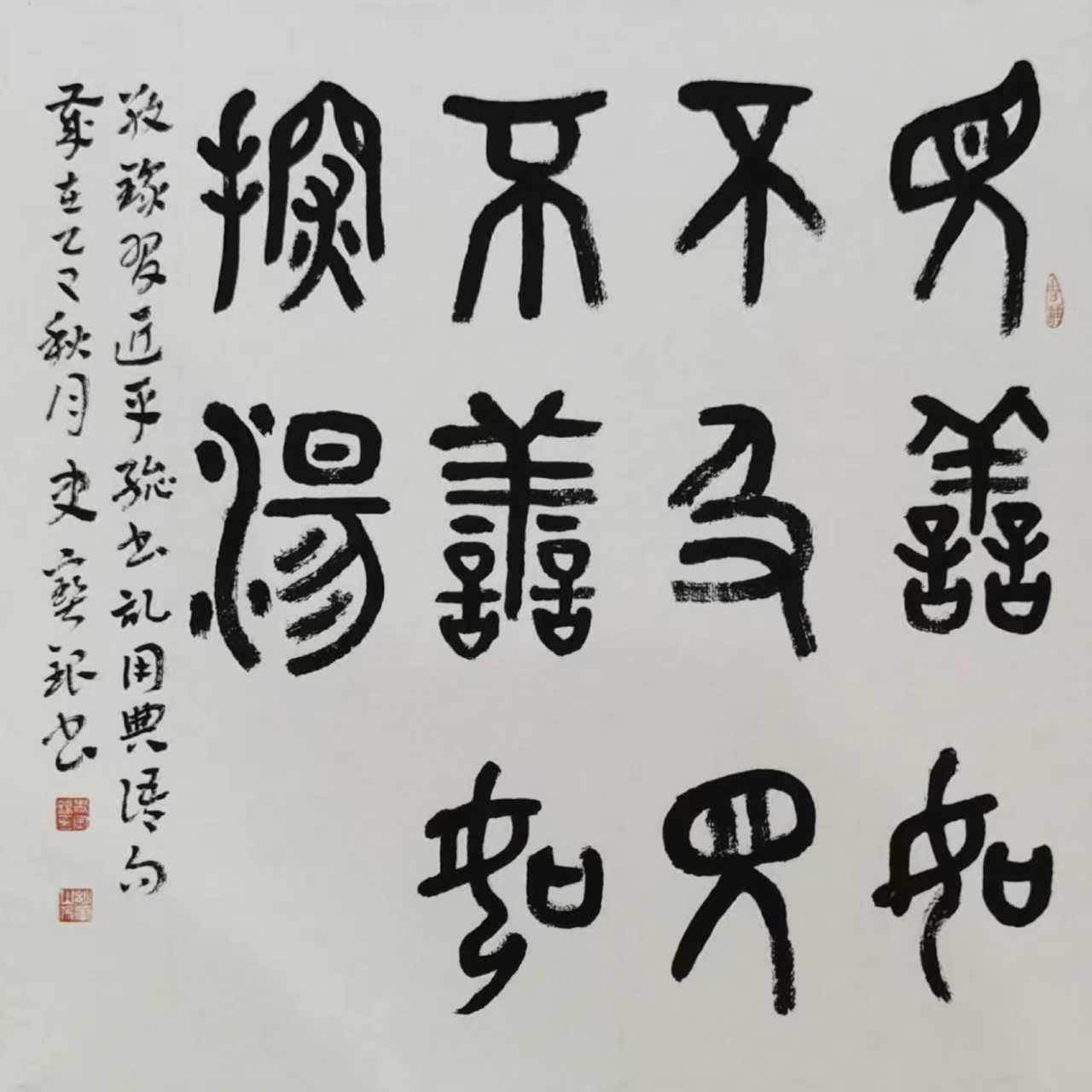 “史宝银书法小品展”共计展出史宝银精心创作的20幅篆书书法作品,书法作品的内容为习近平总书记在其重要讲话及文章中的词句或引用的古代典籍中的经典名句。笔者在现场看到,像“国泰民安”书法作品,史宝银在落款时专门下了感恩祖国、感恩党、祝福祖国,这充分彰显了书家的拳拳爱国之心。