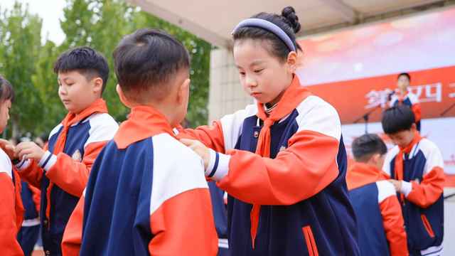 随后,高年级的队员们为新队员们佩戴鲜艳的红领巾(如上图)。当那一抹鲜艳的红色在胸前飘扬时,新队员们的脸上洋溢着自豪与喜悦。他们高高地举起右拳,在队旗下庄严宣誓,那坚定的眼神、响亮的誓言,表达了他们对少先队组织的无限热爱和为队旗增光添彩的决心。