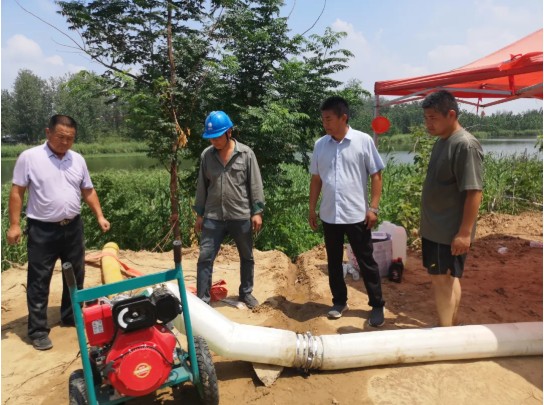 在贾滩镇谢庄行政村记者看到,由镇村干部组成的“抗旱突击队”坚守在抗旱一线,三台大型抽水泵通过水带将河水源源不断输送到沟渠,村民们用引来的河水浇灌着干渴的农作物。清澈的河水流入田间,滋养着万亩粮田,缓缓流淌的河水更是人民群众对生活的希望。