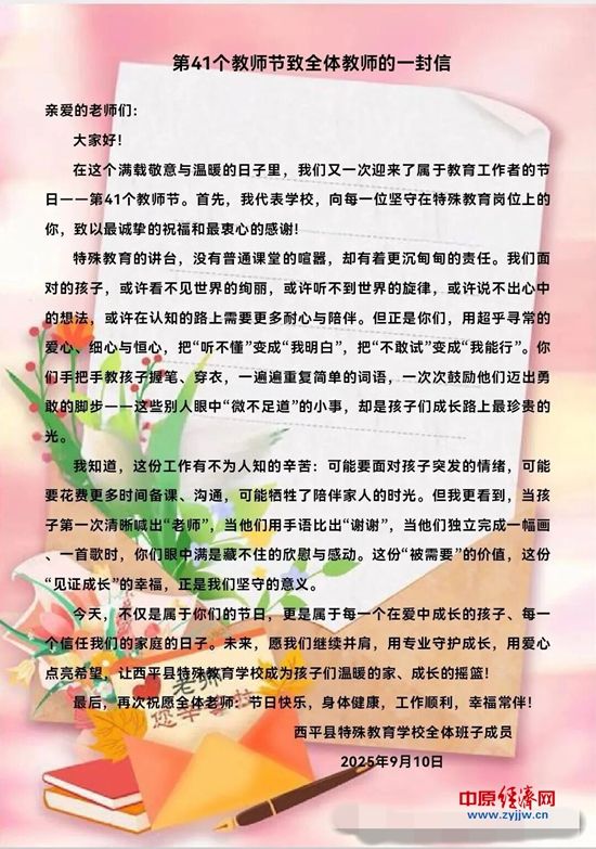 教师节清晨,西平县特殊教育学校党支部书记、校长艾喜勤精心制作祝福贺卡,向学校全体教师献上教师节最真挚最衷心的祝福。校长在致辞中向全体教师致以节日的问候和崇高的敬意,回顾了过去一年学校在教育教学、师资队伍建设、学生成长等方面取得的成绩,并对全体教师的辛勤付出表示衷心感谢。她强调,特殊教育是充满爱与希望的事业,希望全体教师继续秉持初心,不断提升专业素养,用爱心、耐心和责任心呵护每一位特殊孩子的成长。