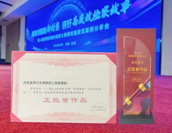 在本次活动中,周口市淮阳区人民检察院在河南省人民检察院、周口市人民检察院指导下制作的原创作品《一首Rap说检察 这群“非遗萌新”水灵灵登场啦!》荣获第八届检察新媒体创意大赛短视频类“正能量作品”。