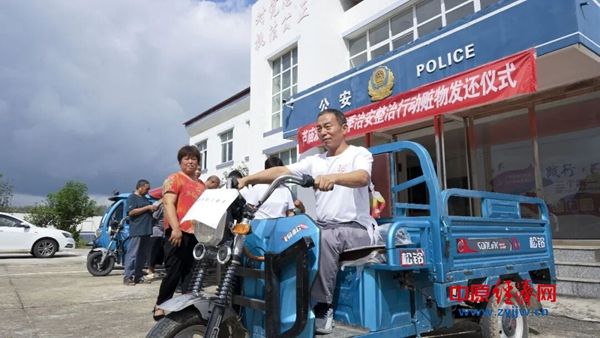 仪式现场,民警向辖区群众通报了案件的破获情况及相关战果,并将追回的电动三轮车及电瓶集中返还给受害群众。