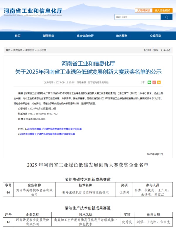 9月12日,2025年河南省工业绿色低碳发展创新大赛获奖企业公示,河南华英农业发展股份有限公司、河南华英樱桃谷食品有限公司历经企业自主申报、工信部门遴选推荐、专家评审、复核等程序,与多家单位同台竞技,分别在节能降碳技术创新成果、清洁生产技术创新成果赛道中脱颖而出,荣获“优秀奖”。