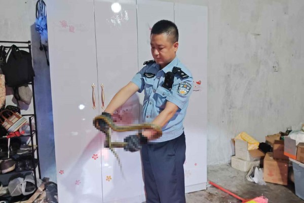 警情就是命令。民辅警立即携带处置工具赶赴现场。原来,一条长约两米的大蛇不知从何处窜入段某家中,在房间内游走,给其家人带来了恐慌。“别担心,我们来处理!”民警一边安抚受惊的居民,一边着手处置工作。民辅警仔细观察蛇的位置和种类后,确认这是一条无毒的绵蛇。看准时机后,民警徒手精准地控制住了蛇的头部位置,随后将其制伏。