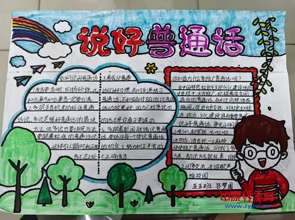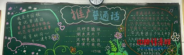 同学们以笔传情、以纸载道的优秀作品展示。大家将学习感悟凝于笔端,化作一张张构思精巧、图文并茂的手抄报,与一幅幅书写规范、结构工整的硬笔书法。黑板报不仅是知识的展示窗,更是推广普通话的前沿阵地。一方小小的黑板,用绚丽的色彩、工整的文字,生动展现着普通话的魅力。它以活泼的图文,讲述着普通话在日常交流、文化传承中的重要意义。