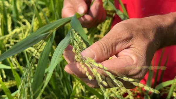 “今年黄金晴长得比去年还好!”曹永笑着说。尽管今年天气偏旱,但得益于附近河流供水稳定,加上干旱少雨的气候恰好利于水稻灌浆,避免了连阴天带来的病害风险,这10亩“黄金晴”的穗粒饱满度远超预期。