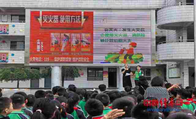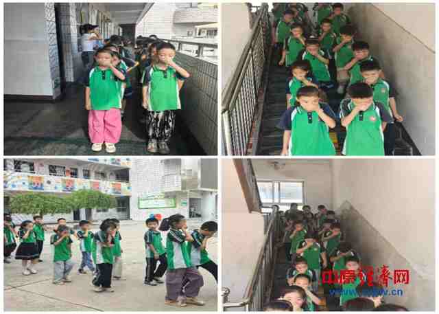 9 月15日下午4时,校园内响起火灾警报,各班级班主任立即组织学生用湿毛巾捂住口鼻,弯腰低姿,沿预定疏散路线快速、有序撤离至操场安全区域。