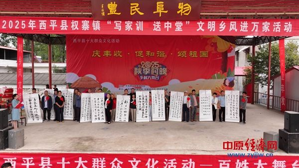 中原经济网驻马店讯(记者 杨晓 全媒体记者 冯占华 通讯员 葛文娟)9月25日下午,西平县权寨镇郭庄村热闹非凡,“写家训 送中堂”文明乡风活动在此开展。西平县委宣传部常务副部长温占营,副部长孙艳芹,县文广旅局副局长宋敬宇,镇党委书记孙凯伟,镇长谢小聘及王文恺等四位书法家同志亲手将一幅幅饱含墨香的家训书法作品,送到村民代表手中,让优良家风以文化载体形式扎根乡村沃土。