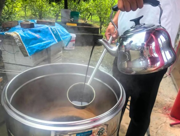 金秋时节,硕果盈枝。鹿邑县贾滩镇田木季农业采摘园内200多亩秋月梨迎来了丰收季,金黄饱满的果实压弯枝头,果香四溢,沁人心脾。采摘园门口的秋梨膏熬制区内,工作人员正在用传统工艺进行现场熬制,飘散的香气吸引了不少游客驻足。
