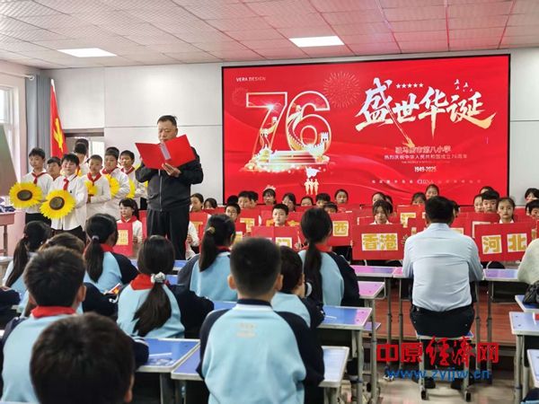 中原经济网驻马店讯(记者 杨晓 全媒体记者 晨曦 通讯员 毛娜) 金秋送爽,丹桂飘香,我们迎来了中华人民共和国成立76周年的光辉节日。为弘扬爱国主义精神,激发全体师生的民族自豪感和历史责任感,驻马店市第八小学在国庆节前夕,精心组织并开展了一系列内容丰富、形式多样的庆祝活动,校园里处处洋溢着喜庆祥和的节日氛围。