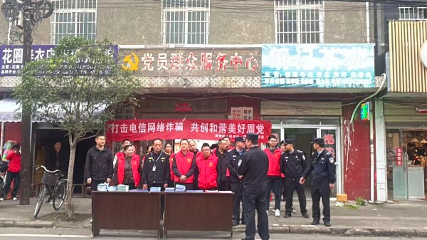 宣传工作中,周党镇坚持线上线下同步发力:线上依托镇、村两级微信群,定期推送反诈知识与预警信息,让群众随时了解最新诈骗动态;线下则在银行网点、超市、集市等人员密集场所悬挂横幅、滚动电子屏标语,并组建起“镇干部+民警+志愿者”的宣传队伍,每月开展一次地摊式宣传——他们会在集市、广场等人流集中处设点,用通俗易懂的故事吸引群众参与,再面对面讲解骗局、传授防范技巧。同时还同步开展“敲门行动”,逐户上门延伸宣传触角。