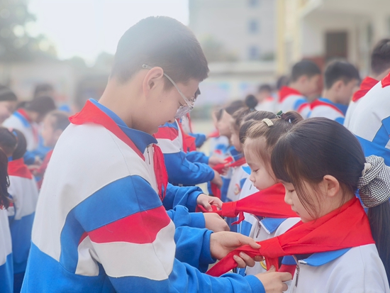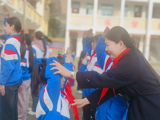 仪式在庄严的出旗曲中拉开帷幕,五、六年级的优秀队员手捧鲜艳的红领巾,郑重地为新队员佩戴。这条用革命先烈的鲜血染红的领巾,不仅是少先队员的标志,更是代代相传的责任与担当。