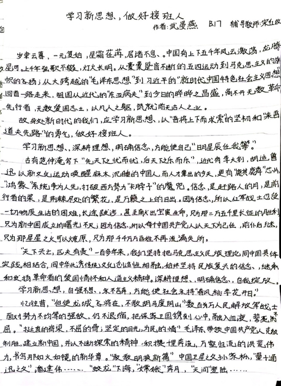 中原经济网驻马店讯(记者 杨晓 全媒体记者 冯占华 通讯员 王意雯 肖雨润)为引导学生牢固树立永远跟党走的理想信念,努力成长为担当民族复兴大任的时代新人,西平高中积极开展“学习新思想,做好接班人”主题作文绘画活动。