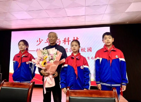 上午10时,报告厅座无虚席。校长姚肖宇致辞,鼓励学生保持科学好奇心,在心中种下航天梦想。随后,少先队员向焦维新献花致敬。