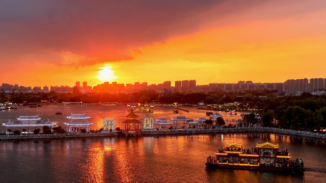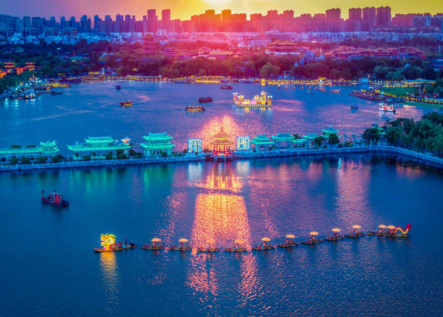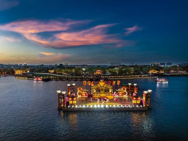 而当暮色降临,夕阳为龙亭湖面镀上金光,古典宋韵与现代时尚在此完美交融。入夜的汴河,化身流动的宋韵舞台——龙舟破浪,花船斗彩,佳人水袖翩飞间,入夜,这里便化身为孟元老笔下的东京城。汴河两岸灯火如昼,在光影交织中,历史与当下相拥。千年前东京城的璀璨繁华,此刻正照进现实。一场梦回大宋的实景大秀震撼上演,堪称现实版的“富贵迷人眼”。