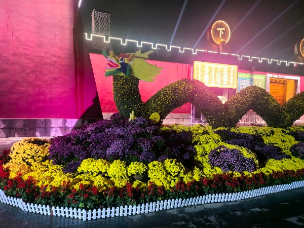 在府门广场的主景“龙腾盛世”,以5000盆菊花铺展成长龙形景观,两侧配以花柱、花瓶与菊球,气势恢宏,象征中华民族昂扬腾飞的时代精神。仪门前的“国泰民安”以四座大型花瓶为主景,正厅内“公生明”景点环绕包公戒石而设,借花喻廉,寓意清正公明。