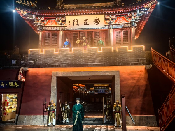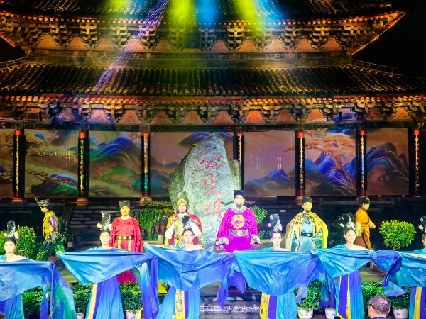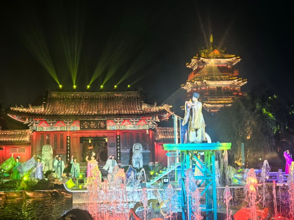 夜幕降临,沉浸式夜间系列实景演出《南衙千秋月》让开封府化身流光溢彩的梦幻舞台。其中,府门广场的《一盏灯·光启千年》点亮夜空;正厅上演的《一座府·天下首府》以声光电技术再现千年府衙气象;英武楼、太子读书台等多个点位还将同步推出《一台武·侠义家国》《一科举·千年魁榜》等武侠、科普、互动类节目。明镜湖畔,《一雅集·遇见苏轼》中的“水月云天舞”“千年之约喷泉秀”等段落将实景演出推向高潮,以灯光、水幕、舞蹈交织出令人震撼的视听体验。