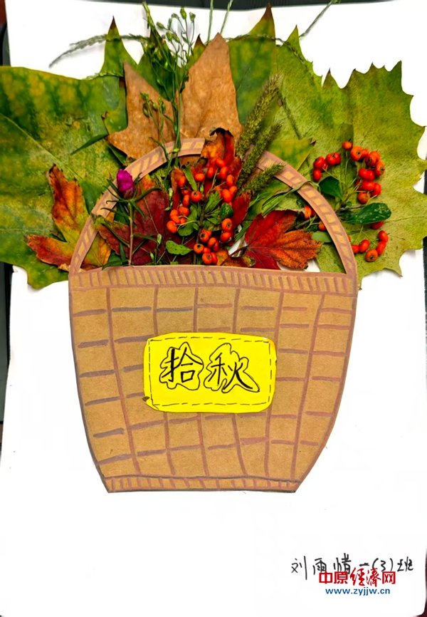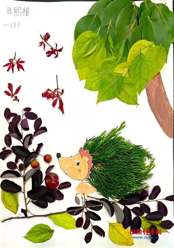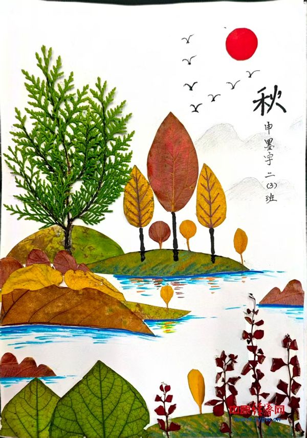 一(3)班武熙橦用松柏叶塑造小刺猬的“尖刺”,搭配深浅绿叶构建森林场景;刘雨惜把枫叶、浆果装进手绘篮筐,呈现《拾秋》的满满收获感。二(3)班申墨宇以不同树叶堆叠成秋林,手绘红日飞鸟点缀,勾勒出秋意山水图;还有同学将树叶与古诗、水墨元素结合,让作品充满文化韵味。