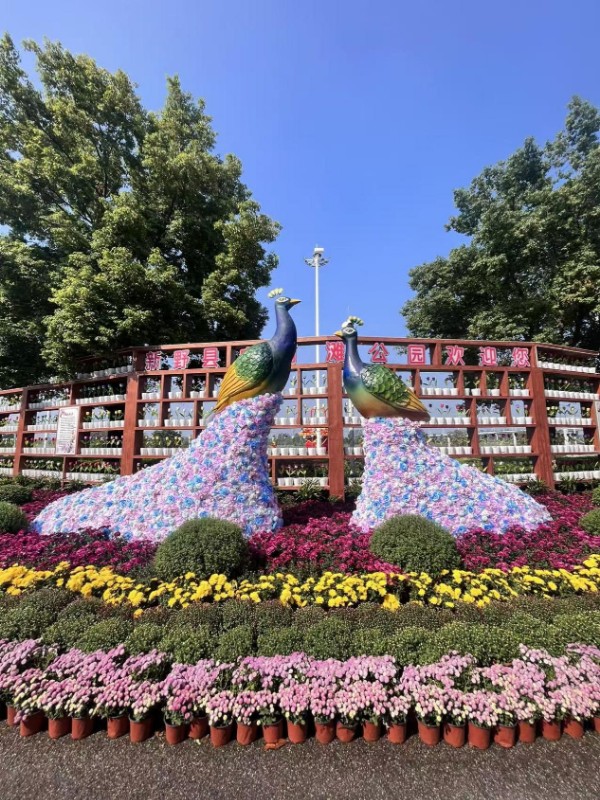 本届新野县菊花文化展期间,白河滩湿地公园内 15 万盆秋菊竞相绽放。公园入口处,栩栩如生的孔雀花艺造型与周围绚烂的花海相得益彰;园内精心打造的 “诸葛抚琴”“汉韵菊香” 等文化景观错落分布,将菊花的自然之美与新野的历史文化深度融合。夜幕降临后,公园开启菊花夜景模式,万千菊株在灯光映照下幻化出如梦如幻的景致,让游客沉浸式体验 “菊夜流光” 的独特韵味。