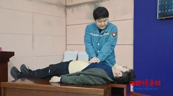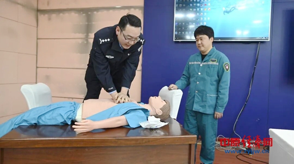 讲座现场,三位医师首先生动模拟了受害人遭遇电信诈骗突发冠心病场景,急诊科医师左鹤朋从施救前判断、施救、施救后再判断等方面对心肺复苏进行了详细的讲解,教授民辅警如何进行急救。他还利用“模拟人”对各项应急救护操作要点进行了演示,并邀请民辅警现场实操,一对一、手把手纠正错误动作。