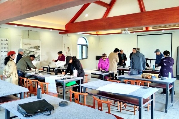 活动首站设在潢川县大别山农民书画协会所在地——仁凌山庄。会员们漫步于素有“小怡和园”美誉的庭园中,领略自然景致与人文意境相融合的园林风貌,在移步换景间汲取创作灵感。随后,研究会同大别山农民书画协会开展笔会交流,两地会员展纸挥毫、以墨会友,现场创作多幅展现地域特色、反映时代气象的书画作品。笔墨流转间,不仅传递出对传统艺术的执着追求,更体现了基层书画文化的蓬勃生机。