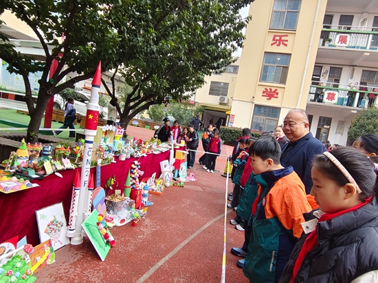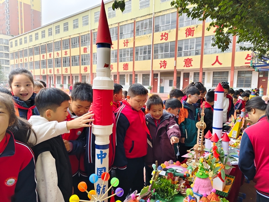展台前,西平二小的红领巾们兴致盎然:有人踮脚数火箭的舱门,有人轻碰银杏蝴蝶的翅膀,有人拉着同伴说“我也要用树叶做只小狮子”……那些和家长一起趴在桌前剪剪贴贴的夜晚,那些为“怎么让秋千荡起来”反复琢磨的时刻,都在这一刻变成眼里的光、嘴角的笑。