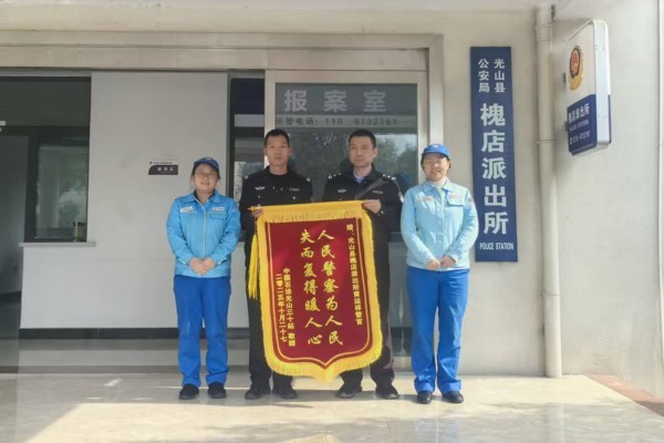 “真没想到这么快就能把钱追回来,太感谢你们了!”10月27日上午,辖区某加油站两名工作人员专程来到光山县公安局槐店派出所,将一面上书“人民警察为人民 失而复得暖人心”的锦旗送到民警手中,以此表达对民警快速帮助他们挽回损失的感激之情。
